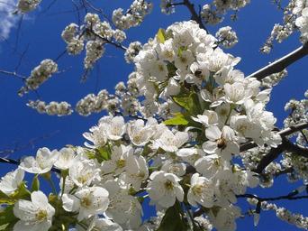 Keywords: blossoms spring apple blossom sky bees flower flowering petals floral
