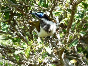 Keywords: blue ear-honey-eater bird exot australia entomyzon cyanotis songbird honey eater yellowish olive green blue iridescent spot meliphagidae sparrow bird