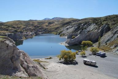 | Keywords: outdoor landscape rock Blue Lake is a small lake adjacent to the town of Saint Bathans in Central Otago, New Zealand. The lake is man-made, the result of sluicing operations that began in 1873 when John Ewing (1844–1922) formed the St.Bathans Channel Company, to mine the Kildare Hill Gold Claim in St Bathans. His company constructed a tailings channel and introduced hydraulic elevating to work the claim. As this work progressed the Kildare Hill Claim became the site of the deepest hydraulic elevating operation in the world, that would turn a 120-metre hill into a 68-metre hole. Work stopped in 1902 when there was insufficient fall in the tailings channel to carry away the tailings. By 1905 John Ewing was bankrupt as a result of poor investments in other locations. The Kildare Hill Claim was then taken up by the Scandinavian Water Race Company in that year. This company restarted operations and worked the claim until 1932, when it was finally abandoned due to the fear of undermining the town of St Bathans. Natural drainage from the surrounding hills filled the hole with water and created the present day lake. The Blue Lake is a key feature of modern-day St. Bathans and is used for swimming, fishing, bodyboarding, and kayaking. en.wikipedia.org/wiki/Blue_Lake_(Otago) Blue Lake is a small lake adjacent to the town of Saint Bathans in Central Otago, New Zealand. The lake is man-made, the result of sluicing operations that began in 1873 when John Ewing (1844–1922) formed the St.Bathans Channel Company, to mine the Kildare Hill Gold Claim in St Bathans. His company constructed a tailings channel and introduced hydraulic elevating to work the claim. As this work progressed the Kildare Hill Claim became the site of the deepest hydraulic elevating operation in the world, that would turn a 120-metre hill into a 68-metre hole. Work stopped in 1902 when there was insufficient fall in the tailings channel to carry away the tailings. By 1905 John Ewing was bankrupt as a result of poor investments in other locations. The Kildare Hill Claim was then taken up by the Scandinavian Water Race Company in that year. This company restarted operations and worked the claim until 1932, when it was finally abandoned due to the fear of undermining the town of St Bathans. Natural drainage from the surrounding hills filled the hole with water and created the present day lake. The Blue Lake is a key feature of modern-day St. Bathans and is used for swimming, fishing, bodyboarding, and kayaking. en.wikipedia.org/wiki/Blue_Lake_(Otago) |