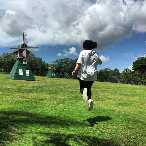 Keywords: blue sky and white clouds grassland jumping windmill happy small fresh summer