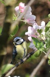 Keywords: blue tit bird blossom caterpillar tree