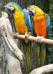 Keywords: blue-and-yellow macaws parrots birds colorful feather perched tropical blue yellow wings portrait looking