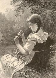 | Keywords: Blumenorakel.jpg en Blumenorakel flower oracle/sortilege by Carl Böker 1836-1905 Immediate image source Own scan from magazine Velhagen Klasings Neue Monatshefte volume 1890/91 issue 9 May 1891 opposite page 344 Artist Carl Böker 1836-1905 Own scan by User Gestumblindi First publication unknown this publication in 1891 PD-Art Art of Germany People with flowers in art Carl Böker |