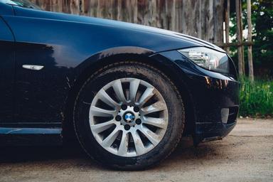 Keywords: bmw car vehicle automobile blue wheel parked outdoors transportation road dirty grass