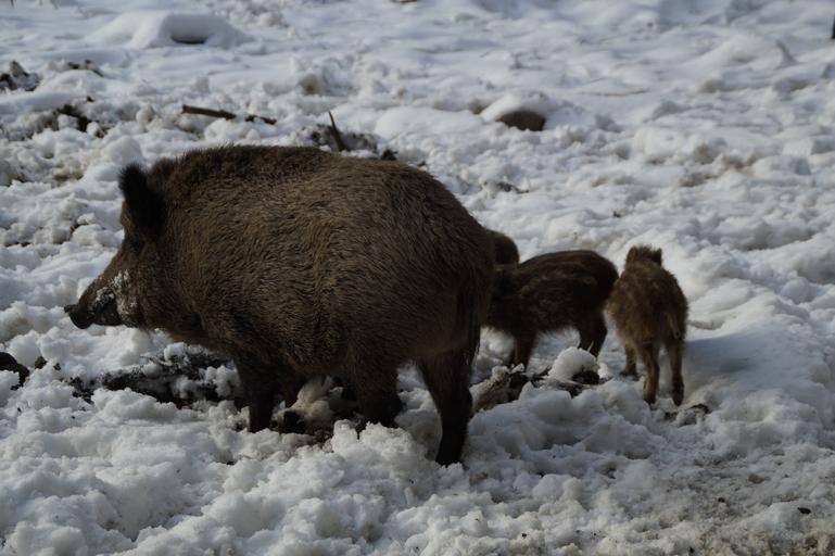 Keywords: boar wild boar pig forest deer park bache wildlife park animal mother bristles foraging habitat winter wintry snowy
