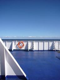 Keywords: boat ferry transport sea ship ocean blue sky life preserver