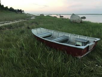 Keywords: boat grass water sky nature summer outdoor sea coastline shore horizon transport rowboat scene vacation beach