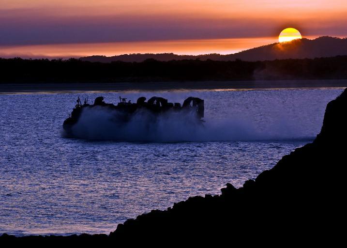 Keywords: boat landing craft military evening sunset transporting soldiers water scenic dusk nautical ocean hover air coastline fast