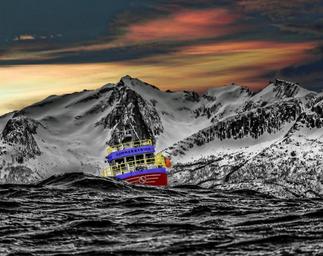Keywords: boat sea big waves ocean water vessel nautical blue sky transport travel transportation fishing boat snow journey trip ship waves rough seas mountain