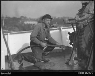 | Keywords: hood collection hoodcollection samuel j hood collection samueljhoodcollection sam hood samhood samuel j hood studio collection samueljhoodstudiocollection hood count felix graf von luckner countfelixgrafvonluckner count von luckner countvonluckner von luckner vonluckner seeteufel sydney sydney harbour sydneyharbour neutral bay neutralbay kirribilli kurraba point kurrabapoint auxiliary cruiser auxiliarycruiser schooner german crew boatswain karl muller karlmuller blackandwhite monochrome black and white This photograph depicts the boatswain of SEETEUFEL, Karl Muller, smoking a pipe and hosing the vessel's deck, during Count Felix Graf von Luckner's visit to Sydney in May 1938. According to the secret files kept on the von Luckners by the Commonwealth Investigation Branch (CIB), Muller was: ‘afraid to go ashore because he cannot resist the city hotels and as he is 62 years of age cannot stand up to hard drinking.' These files are held within the National Archives of Australia. For more information on Count von Luckner's visit see our blog post 'Espionage and paranoia: The Sea Devil tours Australia'. This photo is part of the Australian National Maritime Museum’s Samuel J. Hood Studio collection. Sam Hood (1872-1953) was a Sydney photographer with a passion for ships. His 60-year career spanned the romantic age of sail and two world wars. The photos in the collection were taken mainly in Sydney and Newcastle during the first half of the 20th century. The ANMM undertakes research and accepts public comments that enhance the information we hold about images in our collection. This record has been updated accordingly. Photographer: Samuel J. Hood Studio Collection Object no. 00036972 This photograph depicts the boatswain of SEETEUFEL, Karl Muller, smoking a pipe and hosing the vessel's deck, during Count Felix Graf von Luckner's visit to Sydney in May 1938. According to the secret files kept on the von Luckners by the Commonwealth Investigation Branch (CIB), Muller was: ‘afraid to go ashore because he cannot resist the city hotels and as he is 62 years of age cannot stand up to hard drinking.' These files are held within the National Archives of Australia. For more information on Count von Luckner's visit see our blog post 'Espionage and paranoia: The Sea Devil tours Australia'. This photo is part of the Australian National Maritime Museum’s Samuel J. Hood Studio collection. Sam Hood (1872-1953) was a Sydney photographer with a passion for ships. His 60-year career spanned the romantic age of sail and two world wars. The photos in the collection were taken mainly in Sydney and Newcastle during the first half of the 20th century. The ANMM undertakes research and accepts public comments that enhance the information we hold about images in our collection. This record has been updated accordingly. Photographer: Samuel J. Hood Studio Collection Object no. 00036972 |