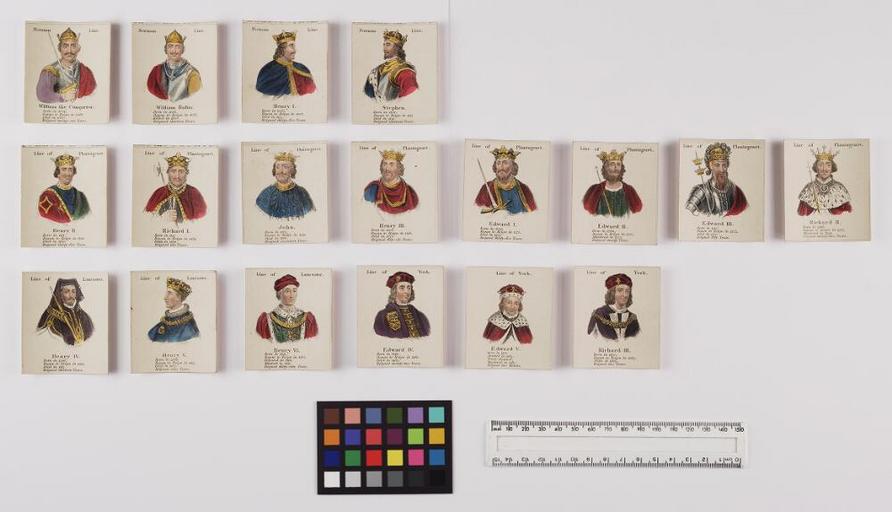 | Keywords: Bodleian Libraries, Cards depicting monarchs- lacking title page 26.jpg Cards depicting monarchs lacking box and title page ; Norman line William the Conqueror; Norman line William Rufus; Norman line Henry I; Norman Line Stephen; Line of Plantagenet Henry II; Line of Plantagenet Richard I; Line of Plantagenet John; Line of Plangagenet Henry III; Line of Plantagenet Edward I; Line of Plantagenet Edward II; Line of Plantagenet Edward III; Line of Plantagenet Richard II; Line of Lancaster Henry IV; Line of Lancaster Henry V; Line of Lancaster Henry VI; Line of York Edward IV; Line of York Edward V; Line of York Richard III; Line of the Tudors Henry VII; Line of the Tudors Henry VIII; Line of the Tudors Edward VI; Line of the Tudors Mary; Line of the Tudors Elizabeth; Line of the Stuarts James I Union of the two kingdoms; Line of the Stuarts Charles I; Commonwealth Oliver Cromwell; Line of the Stuarts Charles II; Line of the Stuarts James II; Line of the Stuarts Anne; House of Orange William Mary; Line of Brunswick George I; Line of Brunswick George II; Line of Brunswick George III; Line of Brunswick George IV; Line of Brunswick William IV Victoria; Image 1 single sheets 35p ; 62 x 55 mm exhibition history Allegro identifier 20030919/10 57 36 jl object history object type Licensed-PD-Art PD-old-100 cc-by-4 0 place of creation place of discovery http //digital bodleian ox ac uk/inquire/p//c52514b9-14a6-482d-9782-d1b80c9ea92a Digital Bodleian Template John Johnson Cards depicting monarchs lacking title page Uploaded with GWToolset Bodleian Libraries Cards depicting monarchs lacking title page_26 http //iiif bodleian ox ac uk/iiif/image/2c7d46de-ac4f-4d9e-95c3-929922d95159/full/ 1000 1000/0/default jpg Files uploaded by the Bodleian Libraries' Wikimedian In Residence Dedicated deck card games History of Great Britain William I King of England 1027 or 8-1087 William II King of England 1056 -1100 Henry I King of England 1068-1135 Stephen King of England 1097 -1154 Henry II King of England 1133-1189 Richard I King of England 1157-1199 Henry III King of England 1207-1272 Edward I King of England 1239-1307 Edward II King of England 1284-1327 Edward III King of England 1312-1377 Richard II King of England 1367-1400 Henry IV King of England 1367-1413 Henry V King of England 1387-1422 aHenry VI King of England 1421-1471 Edward IV King of England 1442-1483 Edward V King of England 1470-1483 Richard III King of England 1452-1485 Henry VII King of England 1457-1509 Henry VIII King of England 1491-1547 Edward VI King of England 1537-1553 Mary I Queen of England 1516-1558 Elizabeth I Queen of England 1533-1603 James I King of England 1566-1625 Charles I King of England 1600-1649 Cromwell Oliver 1599-1658 Charles II King of England 1630-1685 James II King of England 1633-1701 Anne Queen of Great Britain 1665-1714 William III King of England 1650-1702 George I King of Great Britain 1660-1727 George II King of Great Britain 1683-1760 George III King of Great Britain 1738-1820 George IV King of Great Britain 1762-1830 William IV King of Great Britain 1765-1837 Victoria Queen of Great Britain 1819-1901 John King of England --1167-1216 Mary Queen consort of William III --1661-1694 |