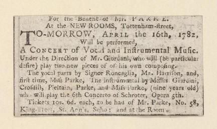 | Keywords: Bodleian Libraries, For the benefit of Mr. Parke.jpg Newscutting relating to The New Rooms April 16th 1782 announcing a concert of vocal and instrumental music for the benefit of Mr Parke; Vocal and instrumental music; For the benefit of Mr Parke single sheet; 37 x 70 mm exhibition history Tomorrow April the 16th 1782 will be performed a concert of vocal and instrumental music Allegro identifier 20030603/15 18 06 hm object history object type Licensed-PD-Art PD-old-100 cc-by-4 0 place of creation place of discovery http //digital bodleian ox ac uk/inquire/p//ef16af1c-89c4-4099-90d9-3dd2437279c9 Digital Bodleian Template John Johnson For the benefit of Mr Parke Uploaded with GWToolset Bodleian Libraries For the benefit of Mr Parke http //iiif bodleian ox ac uk/iiif/image/ef16af1c-89c4-4099-90d9-3dd2437279c9/full/ 1000 1000/0/default jpg Files uploaded by the Bodleian Libraries' Wikimedian In Residence Concerts in London Singing Instrumental music Clippings |