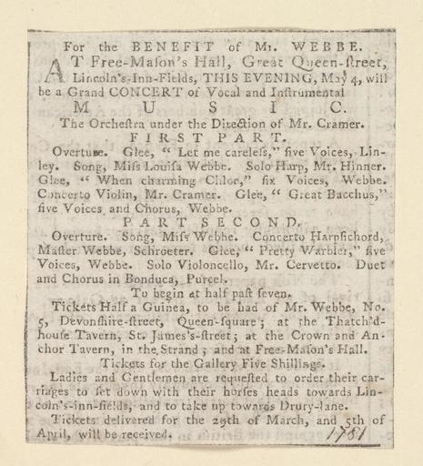 Keywords: Bodleian Libraries, For the benefit of Mr. Webbe.jpg Newscutting relating to Free Mason's Hall May 4th 1781 announcing A grand concert of vocal and instrumental music for the benefit of Mr Webbe; Grand concert of vocal and instrumental music; For the benefit of Mr Webbe single sheet; 49 x 64 mm exhibition history At Free Mason's Hall Great Queen Street Lincoln's Inn-Fields this evening May 4 will be a grand concert of vocal and instrumental music Allegro identifier 20030604/17 34 50 hm object history object type Licensed-PD-Art PD-old-100 cc-by-4 0 place of creation place of discovery http //digital bodleian ox ac uk/inquire/p//d8f302f4-abb4-4633-b97e-8bf5fc5ce124 Digital Bodleian Template John Johnson For the benefit of Mr Webbe Uploaded with GWToolset Bodleian Libraries For the benefit of Mr Webbe http //iiif bodleian ox ac uk/iiif/image/d8f302f4-abb4-4633-b97e-8bf5fc5ce124/full/ 1000 1000/0/default jpg Files uploaded by the Bodleian Libraries' Wikimedian In Residence Concerts in London Singing Instrumental music Harp Harpsichord Cellos Violins Clippings |