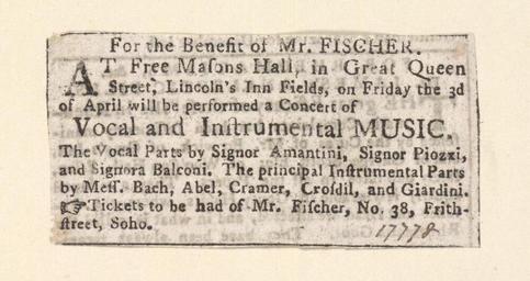 | Keywords: Bodleian Libraries, For the benefit of Mr. Fischer.jpg Newscutting relating to Free Mason's Hall Friday the 3d April 1778 announcing A concert of vocal and instrumental music for the benefit of Mr Fischer; Free Mason's Hall; Concert of vocal and instrumental music; For the benefit of Mr Fischer single sheet; 31 x 64 mm exhibition history At Free Mason's Hall in Great Queen Street Lincoln's Inn Fields on Friday the 3d of April will be performed a concert of vocal and instrumental music Allegro identifier 20030604/16 16 30 hm object history object type Licensed-PD-Art PD-old-100 cc-by-4 0 place of creation place of discovery http //digital bodleian ox ac uk/inquire/p//5fc8917c-1935-4e27-b51a-10dd7e3e5a10 Digital Bodleian Template John Johnson For the benefit of Mr Fischer Uploaded with GWToolset Bodleian Libraries For the benefit of Mr Fischer http //iiif bodleian ox ac uk/iiif/image/5fc8917c-1935-4e27-b51a-10dd7e3e5a10/full/ 1000 1000/0/default jpg Files uploaded by the Bodleian Libraries' Wikimedian In Residence Concerts Singing Instrumental music Clippings Fischer Johann Christian 1733-1800 |