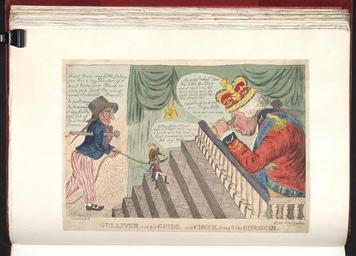 | Keywords: Bodleian Libraries, Gulliver and his guide or- a check string to the Corsican.jpg Satire on the fear of French invasion 1794-1805 British political cartoon ; A sailor Jack Tar holds a rope fixed around the neck of the little Napoleon who climbs steps towards George III his attention fixed on the crown The figure of the king is copied from an earlier print The King of Brobdignag and Gulliver see Curzon b 4 22 ; MS pencil note on reverse John Haines Collection 244 x 349 sheet mm exhibition history Source filename politi004-aat-0001-0 object history object type Licensed-PD-Art PD-old-100 cc-by-4 0 place of creation place of discovery http //digital bodleian ox ac uk/inquire/p//838d0985-6a8b-476e-af09-bd0f438cae87 Digital Bodleian Template Bodleian Libraries Gulliver and his guide or a check string to the Corsican Uploaded with GWToolset Bodleian Libraries Gulliver and his guide or a check string to the Corsican http //iiif bodleian ox ac uk/iiif/image/838d0985-6a8b-476e-af09-bd0f438cae87/full/ 1000 1000/0/default jpg Files uploaded by the Bodleian Libraries' Wikimedian In Residence Napoleonic Wars Caricatures of Napoleon I of France George III of the United Kingdom 1803 cartoons Swift Jonathan 1667-1745 Gulliver's Travels -- Allusions Curzon Collection |