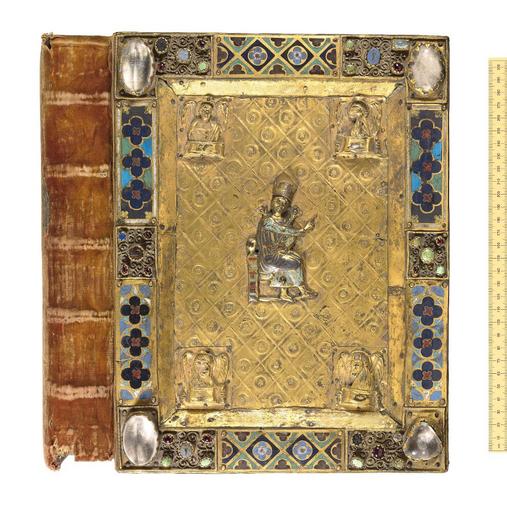 | Keywords: Bodleian Libraries, Homiliae variae.jpg Treasure binding German late 12th or early 13th century Faded red velvet over wooden boards Upper cover fashioned from gilt metal plate sunk into wood decorated with jewels rock crystal and antique cameos; with central figure of a seated king and four evangelists worked in metal relief Jewelled or 'treasure' bindings such as were designed to be carried in procession and displayed during major church services Although both the manuscript from the Cistercian abbey of Himmerod in the diocese of Trier and the cover date from the same period scholars now doubt whether they were originally made to be together exhibition history Spine and front board source filename oulis2009-atb-0090-0 tif object history object type Licensed-PD-Art PD-old-100 cc-by-4 0 place of creation place of discovery http //digital bodleian ox ac uk/inquire/p//ac755f47-6b8a-4c81-92dc-470044389147 Digital Bodleian Template Bodleian Libraries Homiliae variae Uploaded with GWToolset Bodleian Libraries Homiliae variae http //iiif bodleian ox ac uk/iiif/image/ac755f47-6b8a-4c81-92dc-470044389147/full/ 1000 1000/0/default jpg Files uploaded by the Bodleian Libraries' Wikimedian In Residence Bookbinding |
