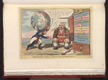 | Keywords: Bodleian Libraries, The modern Atlas asking a favor of Iohn Bull.jpg Caricature of Napoleon I British political cartoon ; Napoleon carrying the globe on his shoulders requests Britain's colonies represented by a cabinet closely guarded by John Bull John Bull smoking a pipe has two pistols stuck in his belt At his feet an oaken cudgel lies across a picture of a ship the Royal George -- one of the ships involved in the mutiny of 1797 ; Attribution by BMC 254 x 352 sheet ; 233 x 328 image and text mm; etching exhibition history Source filename politi004-acl-0001-0 object history object type Licensed-PD-Art PD-old-100 cc-by-4 0 place of creation London England Walker place of discovery http //digital bodleian ox ac uk/inquire/p//671c7e2b-83e6-4978-8bb3-c6a2e4db4bdc Digital Bodleian Template Bodleian Libraries The modern Atlas asking a favor of Iohn Bull Uploaded with GWToolset Bodleian Libraries The modern Atlas asking a favor of Iohn Bull http //iiif bodleian ox ac uk/iiif/image/671c7e2b-83e6-4978-8bb3-c6a2e4db4bdc/full/ 1000 1000/0/default jpg Files uploaded by the Bodleian Libraries' Wikimedian In Residence Caricatures of Napoleon I of France John Bull Colonies -- British 19th-century caricatures 1807 Royal George Ship Curzon Collection |