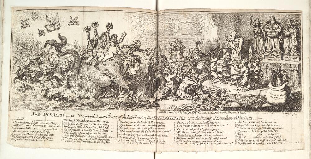 Keywords: Bodleian Libraries, New morality or - The promis'd installment of the highpriest of the Theophilanthropes, with the homage of Leviathan and.jpg accession number Curzon b 3 101 Satire on radical reformers and the French Revolution British political cartoon 615 x 270 image and text mm exhibition history Source filename politi004-ajt-0001-0 object history object type <gallery>File Bodleian Libraries New morality or - The promis'd installment of the high priest of the Theophilanthropes with the homage of Leviathan an jpg</gallery> Licensed-PD-Art PD-old-100 cc-by-4 0 place of creation London England J Wright place of discovery http //digital bodleian ox ac uk/inquire/p//35e7b61c-1ada-4662-8ce0-fe191c34ebe0 Digital Bodleian Template Bodleian Libraries New morality; -- or -- The promis'd installment of the high-priest of the Theophilanthropes with the homage of Leviathan and his suite-Anti-Jacobin Magazine and Review Uploaded with GWToolset Bodleian Libraries New morality or The promis'd installment of the highpriest of the Theophilanthropes with the homage of Leviathan and http //iiif bodleian ox ac uk/iiif/image/35e7b61c-1ada-4662-8ce0-fe191c34ebe0/full/ 1000 1000/0/default jpg Files uploaded by the Bodleian Libraries' Wikimedian In Residence Anglo-French War Louis-Marie de La Révellière-Lépeaux Robert Southey Samuel Taylor Coleridge Lloyd Charles 1775-1839 Lamb Charles 1775-1834 Erasmus Darwin Joseph Priestley in art Wakefield Gilbert 1756-1801 John Russell 6th Duke of Bedford John Thelwall Charles James Fox George Tierney Nicholls John 1745 -1832 Thomas Erskine 1st Baron Erskine Samuel Whitbread 1764 “1815 Charles Howard 11th Duke of Norfolk George Shuckburgh-Evelyn Edward Smith-Stanley 12th Earl of Derby George Byng 1764-1847 John Courtenay politician William Petty 2nd Earl of Shelburne Charles Stanhope 3rd Earl Stanhope John Horne Tooke Taylor Michael Angelo 1757-1834 James Maitland 8th Earl of Lauderdale Thomas Paine Thomas Holcroft William Godwin David Williams philosopher Radicalism and reform Sedition and treason Book pages Newspapers Monsters Education and science Curzon Collection 1798 cartoons |