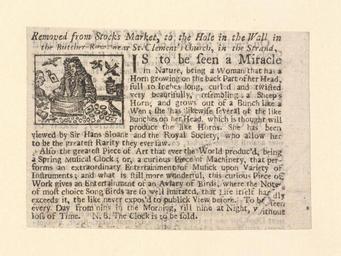 | Keywords: Bodleian Libraries, Newscutting relating to Hole in the wall in the Butcher-Row announcing a Woman with horn growing.jpg Newscutting relating to Hole in the wall in the Butcher-Row announcing a Woman with horn growing; Woman with horn growing; Spring musical clock; Newscutting relating to Hole in the wall in the Butcher-Row announcing a Woman with horn growing single sheet; 59 x 85 mm exhibition history Removed from Stocks Market to the hole in the wall in the Butcher-Row near St Clement's Church in the Strand is to be seen a miracle in nature being a woman that has a horn growing on the back part of her head Allegro identifier 20030616/14 59 51 hm object history object type Licensed-PD-Art PD-old-100 cc-by-4 0 place of creation place of discovery http //digital bodleian ox ac uk/inquire/p//5be7fa35-a4e6-44c2-a04b-b9b1f753d45e Digital Bodleian Template John Johnson Newscutting relating to Hole in the wall in the Butcher-Row announcing a Woman with horn growing Uploaded with GWToolset Bodleian Libraries Newscutting relating to Hole in the wall in the Butcher-Row announcing a Woman with horn growing http //iiif bodleian ox ac uk/iiif/image/5be7fa35-a4e6-44c2-a04b-b9b1f753d45e/full/ 1000 1000/0/default jpg Files uploaded by the Bodleian Libraries' Wikimedian In Residence Abnormalities Human Women Horns Mechanical toys Musical instruments Curiosities Exhibitions Clippings Wigs Clothing Equipment Freaks |