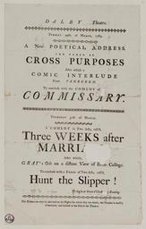 | Keywords: Bodleian Libraries, Playbill of Dalby Theatre, Tuesday 29th. of March, Thursday 31st. of March 1785, announcing Cross purposes &c..jpg Playbill of Dalby Theatre Tuesday 29th of March Thursday 31st of March 1785 announcing Cross purposes c ; bill has plays for 29th and 31st of March Badley creased and torn with hole affecting word 'marriage'; Cross purposes; Comic interlude; Commissary; Three weeks after marriage; Gray's ode on a distant view of Eton College; Hunt the slipper; Playbill of Dalby Theatre Tuesday 29th of March Thursday 31st of March 1785 announcing Cross purposes c single sheet; 321 x 200 mm exhibition history New poetical address 011087 object history object type Licensed-PD-Art PD-old-100 cc-by-4 0 place of creation s l England s n place of discovery http //digital bodleian ox ac uk/inquire/p//158375ef-49f5-4458-9b31-38307f1c6f5d Digital Bodleian Template John Johnson Playbill of Dalby Theatre Tuesday 29th of March Thursday 31st of March 1785 announcing Cross purposes c Uploaded with GWToolset Bodleian Libraries Playbill of Dalby Theatre Tuesday 29th of March Thursday 31st of March 1785 announcing Cross purposes c http //iiif bodleian ox ac uk/iiif/image/158375ef-49f5-4458-9b31-38307f1c6f5d/full/ 1000 1000/0/default jpg Files uploaded by the Bodleian Libraries' Wikimedian In Residence Theater England--Dalby--History--18th century Playbills farce |