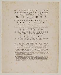 | Keywords: Bodleian Libraries, Playbill (facsimile) of Haymarket Theatre, Thursday, December 13, 1770, announcing A grand transparent scene &c..jpg Playbill facsimile of Haymarket Theatre Thursday December 13 1770 announcing A grand transparent scene c ; facsimile ; Grand transparent scene; Love and resolution; New ballad dance; Playbill facsimile of Haymarket Theatre Thursday December 13 1770 announcing A grand transparent scene c single sheet; 284 x 227 mm exhibition history Mr Maddox will exhibit several performances on the slack wire Allegro identifier 20020322/15 28 09 af object history object type Licensed-PD-Art PD-old-100 cc-by-4 0 place of creation s l England s n place of discovery http //digital bodleian ox ac uk/inquire/p//335bddd1-2e04-42d6-9d8c-f4e65cf7a717 Digital Bodleian Template John Johnson Playbill facsimile of Haymarket Theatre Thursday December 13 1770 announcing A grand transparent scene c Uploaded with GWToolset Bodleian Libraries Playbill facsimile of Haymarket Theatre Thursday December 13 1770 announcing A grand transparent scene c http //iiif bodleian ox ac uk/iiif/image/335bddd1-2e04-42d6-9d8c-f4e65cf7a717/full/ 1000 1000/0/default jpg Files uploaded by the Bodleian Libraries' Wikimedian In Residence Tightrope walking Child actors Playbills transparency slack wire performer |