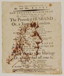 | Keywords: Bodleian Libraries, Playbill of New Theatre, Friday evening May the 2d 1788, announcing The provok'd husband or, A journey to London &c..jpg Playbill of New Theatre Friday evening May the 2d 1788 announcing The provok'd husband or A journey to London c for the benefit of Mr and Mrs Banks; Man's head sketched in brown ink on the blank side The sketch has bled through the paper and is evident on the front ; Provok'd husband or A journey to London; Hunting song; Additional band of music for this night from Middleton; Three weeks after mariage sic or What we must all come to; Playbill of New Theatre Friday evening May the 2d 1788 announcing The provok'd husband or A journey to London c single sheet; 242 x 203 mm exhibition history For the benefit of Mr and Mrs Banks Allegro identifier 19960722/13 38 47 kk object history object type Licensed-PD-Art PD-old-100 cc-by-4 0 place of creation s l England s n place of discovery http //digital bodleian ox ac uk/inquire/p//1378a189-3e87-45bf-b42e-5301d772fa4c Digital Bodleian Template John Johnson Playbill of New Theatre Friday evening May the 2d 1788 announcing The provok'd husband or A journey to London c Uploaded with GWToolset Bodleian Libraries Playbill of New Theatre Friday evening May the 2d 1788 announcing The provok'd husband or A journey to London c http //iiif bodleian ox ac uk/iiif/image/1378a189-3e87-45bf-b42e-5301d772fa4c/full/ 1000 1000/0/default jpg Files uploaded by the Bodleian Libraries' Wikimedian In Residence Theater England--Wirksworth--History--18th century Playbills comedy |