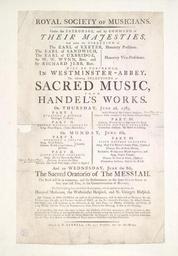 | Keywords: Bodleian Libraries, Royal Society of Musicians.jpg Concert bill of Westminster Abbey Thursday June 2nd 1785 to Wednesday June 8th announcing performances of sacred works by Handel for the benefit of Fund for decayed musicians; selections of sacred music from Handel's works The band will be as numerous and the performances on the same grand scale as they were last year; at the commemoration of Handel Slightly damaged Has manuscript annotations adding two pieces to bill; Esther overture ; Dettingen Te Deum; Second hautboy concerto; Pious orgies; Funeral anthem; Dead march in Saul; How excellent is thy name; Joseph overture ; Total eclipse; O first created beam; Jubilate; Fifth grand concerto; As pants the hart; He gave them hail stone for rain; Lord shall reign; Fifth hautboy concerto; Shall I in Mamre's fertile plain; For all these mercies; O clap your hands together; O give thanks; Ye sons of Israel; Zadock the priest; Messiah; Under the patronage and by the command of their Majesties ; Royal Society of Musicians Great Britain ; Royal Society of Musicians single sheet; 405 x 258 mm exhibition history 003043; t150078 object history object type Licensed-PD-Art PD-old-100 cc-by-4 0 place of creation London England Reynell Henry place of discovery http //digital bodleian ox ac uk/inquire/p//f8bcd9b5-0a5b-4882-b2ce-d9a6e97cbce9 Digital Bodleian Template John Johnson Royal Society of Musicians Uploaded with GWToolset Bodleian Libraries Royal Society of Musicians http //iiif bodleian ox ac uk/iiif/image/f8bcd9b5-0a5b-4882-b2ce-d9a6e97cbce9/full/ 1000 1000/0/default jpg Files uploaded by the Bodleian Libraries' Wikimedian In Residence Concerts in London Overtures Concertos Oboes Anthems Sacred music Westminster Abbey Compositions by Georg Friedrich Händel |