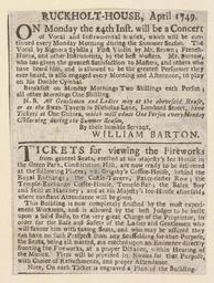 | Keywords: Bodleian Libraries, Ruckholt-House, April 1749.jpg Newscutting relating to Ruckholt-House announcing Vocal and instrumental music and fireworks; lists entertainments at two distinct venues; Vocal and instrumental music; Fireworks; Tickets for viewing the fireworks from genteel seats erected at his Majesty's Ice House in the Green Park Constitution Hill are now ready to be delivered at ; Ruckholt-House April 1749 single sheet; 107 x 80 mm exhibition history On Monday the 24th Inst will be a concert of vocal and instrumental music which will be continued every Monday morning during the summer season Allegro identifier 20030603/12 14 21 hm object history object type Licensed-PD-Art PD-old-100 cc-by-4 0 place of creation place of discovery http //digital bodleian ox ac uk/inquire/p//2270e303-412e-4449-93b4-d7f4dcb86a97 Digital Bodleian Template John Johnson Ruckholt-House April 1749 Uploaded with GWToolset Bodleian Libraries Ruckholt-House April 1749 http //iiif bodleian ox ac uk/iiif/image/2270e303-412e-4449-93b4-d7f4dcb86a97/full/ 1000 1000/0/default jpg Files uploaded by the Bodleian Libraries' Wikimedian In Residence Singing Pianos Harp Clippings |