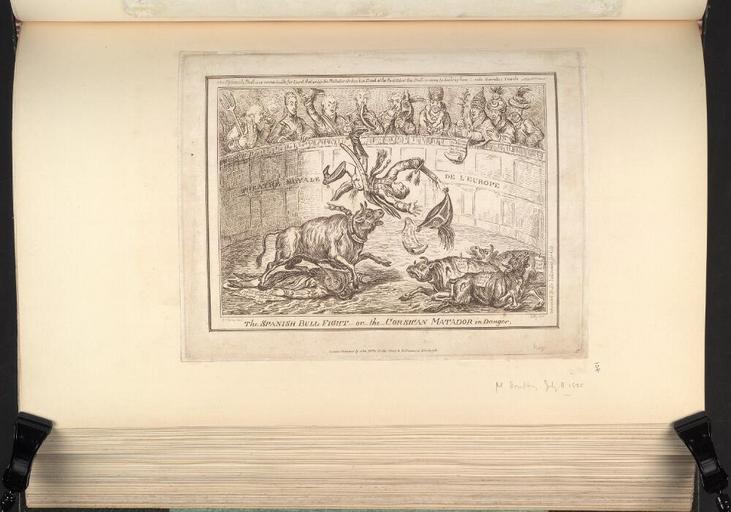 | Keywords: Bodleian Libraries, The Spanish bull fight, or,- the Corsican matador in danger.jpg Satire on the Peninsular war British political cartoon ; The crowned heads of Europe watch and cheer as Napoleon is gored by the Spanish bull his brother Joseph Bonaparte trampled under the animal's hooves ; Not in BMC A copy of a cartoon by James Gillray BMC 10997 252 x 356 sheet mm exhibition history Source filename politi004-axj-0001-0 object history object type Licensed-PD-Art PD-old-100 cc-by-4 0 place of creation London England S W Fores place of discovery http //digital bodleian ox ac uk/inquire/p//6aa3031e-4e2a-473f-8e64-83148d244903 Digital Bodleian Template Bodleian Libraries The Spanish bull fight or the Corsican matador in danger Uploaded with GWToolset Bodleian Libraries The Spanish bull fight or the Corsican matador in danger http //iiif bodleian ox ac uk/iiif/image/6aa3031e-4e2a-473f-8e64-83148d244903/full/ 1000 1000/0/default jpg Files uploaded by the Bodleian Libraries' Wikimedian In Residence Napoleonic Wars Peninsular War George III of the United Kingdom Francis II Holy Roman Emperor John VI King of Portugal 1767-1826 Alexander I of Russia in caricatures Friedrich Wilhelm III of Prussia Caricatures of Napoleon I of France Joseph Bonaparte Gustaf IV Adolf King of Sweden 1778-1837 Pius VII in art Mustafa IV Sultan of the Turks 1779-1808 National stereotypes -- Algiers Animals in art Curzon Collection |