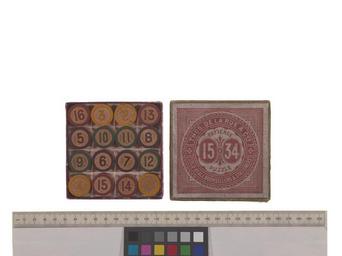 | Keywords: Bodleian Libraries, Thos. de la Rue & Co.'s Patience 15 & 34 puzzle.jpg Game entitled Thos de la Rue Co 's Patience 15 34 puzzle; sold by all booksellers stationers Lid printed in red Has 16 circular blocks with in relief the numbers 1-16 1-4 in yellow 5-8 in brown 9-12 in green 13-16 in red Base has squares outlined in red; Thos de la Rue Co 's Patience 15 34 puzzle box 16 discs; 96 x 95 x 18 mm exhibition history Allegro identifier 20040911/10 26 01 jl object history object type Licensed-PD-Art PD-old-100 cc-by-4 0 place of creation s l England Thomas De La Rue Company place of discovery http //digital bodleian ox ac uk/inquire/p//21344ffc-8bdf-4c47-a4e6-f64475cae8a5 Digital Bodleian Template John Johnson Thos de la Rue Co 's Patience 15 34 puzzle Uploaded with GWToolset Bodleian Libraries Thos de la Rue Co 's Patience 15 34 puzzle http //iiif bodleian ox ac uk/iiif/image/21344ffc-8bdf-4c47-a4e6-f64475cae8a5/full/ 1000 1000/0/default jpg Files uploaded by the Bodleian Libraries' Wikimedian In Residence Educational games Games in mathematics education De La Rue printers |