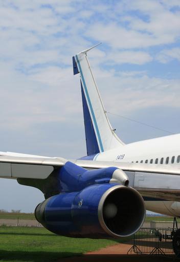 Keywords: boeing 707 military veteran aircraft clouds engine jet engin on wing tailplane green grass air force museum static display blue white