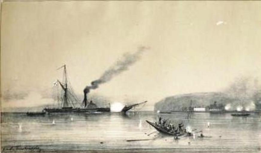 View Original:bogolyubov_steamship_kolkhid_fighting_turkish_boats_st_nicholas_fort_near_poti_georgi_during_1854.jpg (412x242)