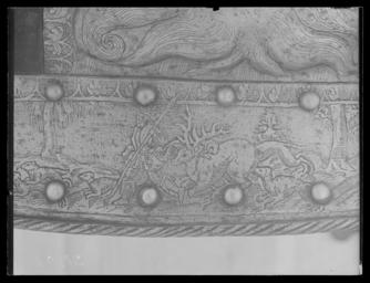 | Keywords: Bogpansar till hästrusning, troligen tillhörigt Johan III, 1500-tal - Livrustkammaren - 79454.tif LSH artwork sv Bestående av sammanlagt elva sammanfogade plåtar med utsidan dekorerad av etsat mönster och rött sammetstyg U-formigt böjt med svagt sluttande sidor och kraftigare sluttande framparti Ram av fyra skenor med ytterkanterna omvikta rundsmidda och djupt repstavsfilade Mittenpartiet utgörs av sju plåtar nitade vid varandra Samtliga nitar har ursprungligen haft brickor på insidan och kullriga mässingsskallar på utsidan Baktill och upptill i var kant ett brunt läderband med nio hål L 295 B 43 mm fäst med två nitar varav de två nedre med blomformig bricka av mässing Plåtarnas insidor är mörbruna längs övre och nedre kanten är nitarna fästade genom 20 mm breda läderband Ramen har heltäckande etsad dekor På övre delen slingrande växtrankor och mytologiska figurer som kentaurer på nedre delen jaktscener med jägare hästar jakthundar och villebråd som hjortar vildsvin och harar På plåtarna som utgör bakre gavlarna finns större motiv På den ena stryper en stående Herakles det nemeiska lejonet under scenen ruta med texten HERKVLES På andra sidan man med långt skägg svärd samt rustning all'antica därunder textruta IOS APHAI Av de sju mittenplåtarna är nr 2 7 drivna och punsade som lejonhuvuden i hög relief med graverade detaljer som hår ögon och tänder Den främsta nr 4 har etsad Herkules med lejonmantel i färd att kasta omkull en fiende nertill textruta HERKVLES Övriga plåtar är helt täckta av pålimmad mörkröd sammet original caption century 16 velvet Färg mörkt röd material sammet - leather Färg brun material läder - brass Färg gul material mässing - steel g 6450 size mm 720 690 357 LRK Johan III av Sverige Tre Konungar på Åbo slott 1993 Björneborg - Johans stad Satakunta Museum Björneborg/Pori 2008 Trofast - hov och tass i kunglig tjänst 2010-2011 Livrustkammaren Trogna vänner - Kungliga hästar och hundar 2011-2012 Museiverket/Finlands nationalmuseum place of origin original filename LN_E02855 59503 inventory number LRK 22861 79454 CC0 Bogpansar till hästrusning troligen tillhörigt Johan III 1500-tal - Livrustkammaren - 79454-negative tif <gallery caption Different images of same object > File Bogpansar till hästrusning troligen tillhörigt Johan III 1500-tal - Livrustkammaren - 44085 tif File Bogpansar till hästrusning troligen tillhörigt Johan III 1500-tal - Livrustkammaren - 35526 tif File Utställningsbild sadlar hästrustningar mm - Livrustkammaren - 77173 tif </gallery> <gallery caption Related objects > File Manpansar möjligen tillhörigt Johan III 1500-talets mitt - Livrustkammaren - 19537 tif LRK 22860 File Ländpansar till hästrustning troligen tillhörigt Johan III 1500-tal - Livrustkammaren - 79460 tif LRK 22862 File Manpansar möjligen tillhörigt Johan III 1500-talets mitt - Livrustkammaren - 36657 tif LRK 22860 File Manpansar möjligen tillhörigt Johan III 1500-talets mitt - Livrustkammaren - 62337 tif LRK 22860 File Ländpansar till hästrustning troligen tillhörigt Johan III 1500-tal - Livrustkammaren - 70895 tif LRK 22862 File Manpansar möjligen tillhörigt Johan III 1500-talets mitt - Livrustkammaren - 70899 tif LRK 22860 File Ländpansar till hästrustning troligen tillhörigt Johan III 1500-tal - Livrustkammaren - 36659 tif LRK 22862 File Manpansar möjligen tillhörigt Johan III 1500-talets mitt - Livrustkammaren - 79458 tif LRK 22860 File Manpansar möjligen tillhörigt Johan III 1500-talets mitt - Livrustkammaren - 53776 tif LRK 22860 File Ländpansar till hästrustning har troligen tillhört Johan III 1500-tal - Livrustkammaren - 10975 tif LRK 22862 File Ländpansar till hästrustning troligen tillhörigt Johan III 1500-tal - Livrustkammaren - 2415 tif LRK 22862 File Manpansar möjligen tillhörigt Johan III 1500-talets mitt - Livrustkammaren - 45215 tif LRK 22860 File Manpansar möjligen tillhörigt Johan III 1500-talets mitt - Livrustkammaren - 10973 tif LRK 22860 File Manpansar möjligen tillhörigt Johan III 1500-talets mitt - Livrustkammaren - 28096 tif LRK 22860 File Manpansar möjligen tillhörigt Johan III 1500-talets mitt - Livrustkammaren - 2413 tif LRK 22860 File Manpansar möjligen tillhörigt Johan III 1500-talets mitt - Livrustkammaren - 35519 tif LRK 22860 </gallery> Horse armours Media contributed by LSH 2016-12 |
