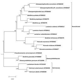 | Keywords: Boidinia-Maximum-Likelihood-Tree.svg Figure Figure Molecular Phylogenetic analysis of Boidinia and Gloeopeniophorella by Maximum Likelihood method <br/> The evolutionary history was inferred by using the Maximum Likelihood method based on the Kimura 2-parameter model 1 The tree with the highest log likelihood -4514 2002 is shown The percentage of trees in which the associated taxa clustered together is shown next to the branches A Strict Consensus Maximum-Parsimony tree was used as an initial tree in the heuristic search A discrete Gamma distribution was used to model evolutionary rate differences among sites 5 categories +G parameter 0 5454 The rate variation model allowed for some sites to be evolutionarily invariable +I 59 4678 sites The tree is drawn to scale with branch lengths measured in the number of substitutions per site The analysis involved 19 nucleotide sequences All positions with less than 95 site coverage were eliminated That is fewer than 5 alignment gaps missing data and ambiguous bases were allowed at any position There were a total of 1167 positions in the final dataset Evolutionary analyses were conducted in http //megasoftware net/ MEGA6 2<br/> 1 Kimura M 1980 A simple method for estimating evolutionary rate of base substitutions through comparative studies of nucleotide sequences Journal of Molecular Evolution 16 111-120 <br/> 2 Tamura K Stecher G Peterson D Filipski A and Kumar S 2013 MEGA6 Molecular Evolutionary Genetics Analysis version 6 0 Molecular Biology and Evolution30 2725-2729 <br/> ; List with GenBank Sequences http //www ncbi nlm nih gov/nuccore/AY048880 Boidinia_granulata AY048880 http //www ncbi nlm nih gov/nuccore/AF506379 Boidinia_propinqua AF506379 http //www ncbi nlm nih gov/nuccore/AF506413 Lactarius_volemus AF506413 http //www ncbi nlm nih gov/nuccore/AF506378 Boidinia_sp AF506378 http //www ncbi nlm nih gov/nuccore/AF506433 Boidinia_aculeata AF506433 http //www ncbi nlm nih gov/nuccore/AF506435 Gloeopeniophorella_convolvens AF506435 http //www ncbi nlm nih gov/nuccore/AF506440 Gloeopeniophorella_laxa AF506440 http //www ncbi nlm nih gov/nuccore/AF506462 Russula_nauseosa AF506462 http //www ncbi nlm nih gov/nuccore/AF506376 Boidinia_furfuracea AF506376 http //www ncbi nlm nih gov/nuccore/AF506426 Pseudoxenasma_verrucisporum AF506426 http //www ncbi nlm nih gov/nuccore/AF506458 Hericium_americanum AF506458 http //www ncbi nlm nih gov/nuccore/AF506456 Hericium_abietis AF506456 http //www ncbi nlm nih gov/nuccore/AF310099 Gloeocystidiellum_porosum AF310099 http //www ncbi nlm nih gov/nuccore/AF506411 Lactarius_leonis AF506411 http //www ncbi nlm nih gov/nuccore/AF506465 Russula_violacea AF506465 http //www ncbi nlm nih gov/nuccore/AF506412 Lactarius_subemboratus AF506412 own 2014-09-05 Thkgk Cc-zero Gloeopeniophorella Boidinia Russulaceae |