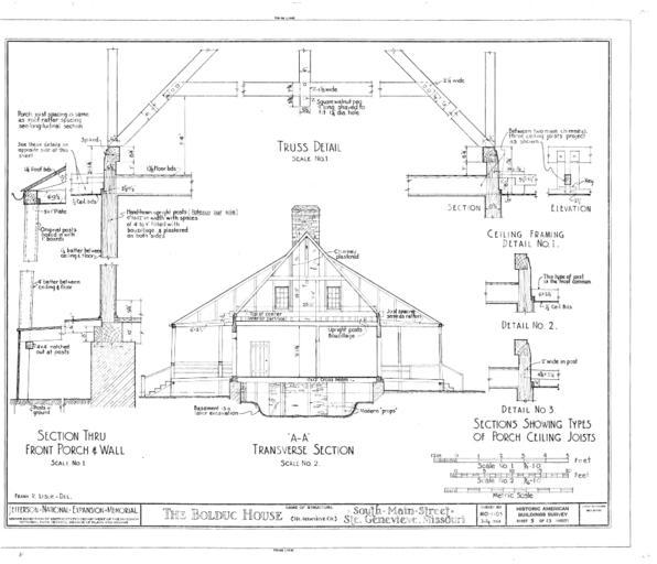 | Keywords: Bolduc House Transverse Section--Ste Genevieve MO.svg The Bolduc House was built by Peter Bolduc a very prominent merchant in1740 in Ste Geneviève Missouri The house along with the rest of the village was moved to its present location on higher ground in 1785 to escape flooding from the Mississippi River Historic American Engineering Record National Park Service; Record MO-1105 1938-07 Drawn by Frank R Leslie MO-1105 Maison Bolduc drawings | ||||