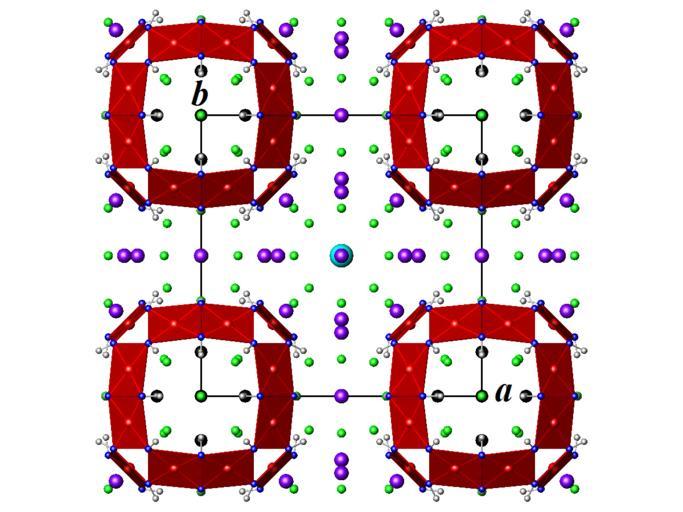 Keywords: Boleite 001.png en Crystal structure of boleite KPb26Ag9Cu24Cl62 OH 48 Pm-3m viewed along the c direction Purple lead atoms black silver atoms red copper atoms cyan potassium atoms green chlorine atoms blue oxygen atoms gray hydrogen atoms own Perditax 2010-08-31 Boleite Crystal structures in space group number 221 |