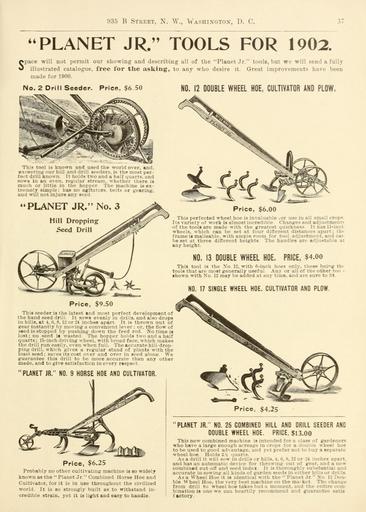 | Keywords: Bolgiano's 1902 catalogue (15727596434).jpg 935 B Street N W Va -iiington D C <br> PLANET JR TOOLS FOR 1902 <br> pace will not permit our showing and describing all of the Planet Jr tools but we will send a fully <br> 1 illustrated catalogue free for the asking to any who desire it Great improvements have been <br> made for 1900 <br> No 2 Drill Seeder Price 6 50 <br> NO 12 DOUBLE WHEEL HOE CULTIVATOR AND PLOW <br> This tool i3 known and used the world over and <br> excepting our hill and drill seeders is the most per- <br> fect drill known It holds two and a half quarts and <br> sows in an even regular stream whether there is <br> much or little in the hopper The machine is ex- <br> tremely simple has no agitators belts or gearing <br> and will not injure any seed <br> PLANET JR No 3 <br> Hill Dropping <br> Seed Drill <br> Price 6 00 <br> This perfected wheel hoe is invaluable ior use in all small crops <br> Its variety of work is almost incredible Changes and adjustment - <br> of the tools are made with the greatest quickness It has 11-incl <br> wheels which can be set at four different distances apart th - <br> frame is malleable with ample room for tool adjustment and car <br> be set at three different heights The handles arc adjustable at <br> any height <br> NO 13 DOUBLE WHEEL HOE PRICE 4 oo <br> This tool is the No 12 with 6-inch hoes only these being th <br> tools that are most generally useful Any or all of the other too - <br> shown with Xo 12 may be added at any time and are sure to tit <br> NO 17 SINGLE WHEEL HOE CULTIVATOR AND PLOW <br> Price 9 50 <br> This seeder is the latest and most perfect development of <br> the hand seed drill It sows evenly in drills and also drops <br> in hills at 4 6 8 12 or 24 inches apart It is thrown out of <br> gear instantly by moving a convenient lever or the flow of <br> seed is stopped by pushing down the feed rod No time is <br> lost no seed is wasted The hopper holds two and a half <br> quarts; 15-inch driving wheel with broad face which makes <br> the drill run easily even when full The accurate hill-drop- <br> ping drill which gives a regular stand of plants with the <br> least seed saves its cost over and over in seed alone We <br> guarantee this drill to be more accurate than any other <br> made and to give satisfaction in every respect <br> PLANET JR NO 9 HORSE HOE AND CULTIVATOR <br> Price 4 25 <br> Price 6 25 <br> Probably no other cultivating machine is so widely <br> known as the Planet Jr Combined Horse Hoe and <br> Cultivator for it is in use throughout the civilized <br> world It is so strongly built as to withstand in- <br> credible strain yet it is light and easy to handle <br> PLANET JR NO 25 COMBINED HILL AND DRILL SEEDER AND <br> DOUBLE WHEEL HOE PRICE 13 00 <br> This new combined machine is intended for a class of gardeners <br> who have a large enough acreage in crops for a double wheel hoe <br> to be used to good advantage and yet prefer not to buy a separate <br> wheel hoe Holds IX quarts <br> As a drill it will sow in drills or hills 4 6 8 12 or 24 inches apart <br> and has an automatic device for throwing out of gear and a new <br> combined cut-off and seed index It is thoroughly substantial and <br> accurate in sowing all kinds of garden seeds in either hills or <br> Asa Wheel Hoe it is identical with the Planet lr No 12 Dou- <br> ble Wheel Hoe the very best machine on the maiket Tht- change <br> from drill to wheel hoe takes but a moment and the entir <br> bination is one we can heartily recommend and guarantee satis <br> f actory 42156287 132756 65911 Page 37 Text http //www biodiversitylibrary org/page/42156287 1902 10 5962/bhl title 65911 F W Bolgiano Co ; Henry G Gilbert Nursery and Seed Trade Catalog Collection Biodiversity Heritage Library Bolgiano's 1902 catalogue tested seeds for the garden and farm Garden Stories Bulbs Plants Catalogs Fruit Garden tools Nurseries Horticulture Seeds Vegetables U S Department of Agriculture National Agricultural Library bhl page 42156287 dc identifier http //biodiversitylibrary org/page/42156287 bhlGardenStories BHLinbloom bulbs plants nurseries horticulture u s department of agriculture national agricultural library bhlgardenstories bhlinbloom Information field Flickr posted date ISOdate 2015-01-23 Check categories 2015 August 24 CC-BY-2 0 BioDivLibrary https //flickr com/photos/61021753 N02/15727596434 2015-08-24 08 55 44 cc-by-2 0 PD-old-70-1923 Bolgiano's 1902 catalogue Photos uploaded from Flickr by FĂŚ using a script |