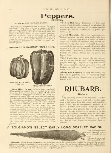 | Keywords: Bolgiano's 1902 catalogue (16162708920).jpg  26 <br> F \V BOLGIAXO cS CO <br> <br> OUNCE TO ONE THOUSAND PLANTS <br> Peppers are indispensable as a seasoning for soups <br> and meats The large varieties are mainly used for <br> this purpose and pickling The mild sweet varietic s <br> like Sweet Mountain Bull Nose and Ruby King are <br> used for Mangoes wliile the small fruited sorts are <br> the best for sauces Sow in hot-beds in March or <br> April or on a warm sheltered border in May and <br> when the season is favorable transplant in rows 2 <br> feet apart and 18 inches in the row in good rich <br> mellow ground <br> BOLGIANO'S MAMMOTH RUBY KING <br> PFEFFERS <br> TSell Or Hull Nose ” Produces a very large-sized <br> pepper which is highly esteemed for pickling the <br> skin being thicker than any of the other varieties <br> Packets 5c and 10c Ounce 20c pound 50c <br> Pound 1 50 <br> Sweet Mountain ” Plantsvery vigorous and pro- <br> ductive growing upright with moderately large <br> leaves Fruit very large often 8 inches or more in <br> length by 2 inches in diameter very smooth and <br> handsome being when unripe of a bright deep green <br> color entirely free from any purple tinge and when <br> matured of a rich red Flesh very thick sweet and <br> mild flavored Well suited to use as a stuffed pickle <br> Packets 5c and 10c Ounce 20c x \ pound 50c <br> Pound 1 50 <br> Ked Chili ” They are pointed like the cayenne <br> but not so long nor so thick and are exceedingly <br> pungent when ripe Requires a long warm season <br> The plants should be started quite early in hot-bed <br> Packets 5c and 10c Ounce 20c '4 pound 50c <br> Pound 2 00 <br> BELL OK BULL NO8E <br> PEPPER <br> RUBY KING PEPPER <br> Ruby King- Pepper ” Since first introduced <br> tbfs magnificent variety has so gained in popular <br> favor that it is now recognized as the best and most <br> piofitablemild red pepper for market or family use <br> Every one who has seen our crops has been enthusi- <br> astic in praise of the beautiful plants crowded with <br> the large handsome fruits of a bright ruby red color <br> The peppers ordinarily grow A\ to G inches long by <br> 3i to 4£ inches through Added to their beautiful <br> color when ripe is the fact that they are <br> remarkably mild mid pleasant to the taste; in this <br> respect unequalled by any other red pepper We <br> cannot too strongly recommend the Ruby King ” so <br> mild and pleasant in their flavor they can even be <br> sliced and eaten with pepper and vinegar like to- <br> matoes or cucumbers and makes a very pleasant and <br> appetizing salad while for stuffing and pepper hash <br> no other variety can equal them ” Packets 5c and <br> Iflfe Ounce 20c £ Pound 60c Pound 2 00 Free <br> iv mail <br> l/L <br> iOng' Keel Cayenne ” A long red variety very <br> hot and is generally used for seasoning soups <br> Packets 5c and 10c Ounce 20c pound 50c <br> Pound 1 50 <br> RHUBARB <br> Rbubarb <br> r ery familiarly known as the Pie Plant The foot <br> stalk is the portion that is used and is the first vege- <br> table of the season from the garden ; cultivated to a <br> great extent and is indispensable wmerever it is <br> known Sow the seed early in the spring in rows r <br> foot apart on rich ground ; the second year after <br> planting they can be removed in autumn to the per- <br> manent spot allotted to them ; plant the roots 2 feet <br> apart each way in ground that is well enriched at <br> least 2 feet deep Packet 10c Ounce 20c l i pound <br> 50c Pound 1 50 Roots 75c per dozen ; 54-00 per <br> hundred <br> BOLGIANO'S SELECT EARLY LONG SCARLET RADISH <br> Six ounces seed will <br> plant 100-yard row ; 8 <br> 3»_ to 12 pounds to the <br> acre <br> Grown from select- <br> ed transplanted roots <br> Selected Early Long Scarlet ” This improved strain of Long Scarlet Radish is regarded by our most <br> extensive market gardeners to be the finest stock they ever grew ; for earliness brilliancy of color and shortness <br> of top in cannot be surpassed and is the most profitable one to grow for an early crop Packet 5c Ounce toc <br> 4 pound 15c ' 2 pound 20c Pound 30c 10 pounds 2 50 42156276 132756 65911 Page 26 Text http //www biodiversitylibrary org/page/42156276 1902 10 5962/bhl title 65911 F W Bolgiano Co ; Henry G Gilbert Nursery and Seed Trade Catalog Collection Biodiversity Heritage Library Bolgiano's 1902 catalogue tested seeds for the garden and farm Garden Stories Bulbs Plants Catalogs Fruit Garden tools Nurseries Horticulture Seeds Vegetables U S Department of Agriculture National Agricultural Library bhl page 42156276 dc identifier http //biodiversitylibrary org/page/42156276 bhlGardenStories BHLinbloom bulbs plants nurseries horticulture u s department of agriculture national agricultural library bhlgardenstories bhlinbloom Information field Flickr posted date ISOdate 2015-01-23 Check categories 2015 August 24 CC-BY-2 0 BioDivLibrary https //flickr com/photos/61021753 N02/16162708920 2015-08-24 08 54 25 cc-by-2 0 PD-old-70-1923 Bolgiano's 1902 catalogue Photos uploaded from Flickr by Fæ using a script |