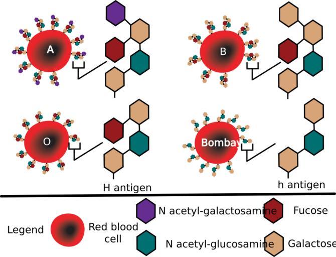 Keywords: Bombay.svg Diagram showing the molecular structure of the Bombay phenotype important in transfusion medicine Created by me 9/10/06 released into public domain 2006-09-11 own assumed InvictaHOG~commonswiki Medical diagrams Blood types