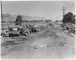 | Keywords: Bombing campaign. Europe & North Africa - NARA - 292584.tif Scope and content AIR PUNISHMENT FOR THE RETREATING NAZI - The retreating Nazi in France gets no rest from the Allied Air Forces The photograph shows how his convoy and vehicles are continually under bombardment of allied airmen An American jeep drives through two twisted lines of what used to be the transport of a German panzer division knocked out by P-47 Thunder-bombers and then piled high on either side of the road by bulldozers of the advancing 7th Army in France General notes 292584 Local identifier Department of Defense Department of the Army Fort Leavenworth Kansas 09/18/1947 - NARA's Central Plains Region Kansas City NREA 400 West Pershing Road Kansas City MO 64108 other date circa 1942 1945 Record group Record Group 338 Records of U S Army Operational Tactical and Support Organizations World War II and Thereafter 1917 - 1999 Record group ARC 651 Ft Leavenworth Signal Corps Photograph Collection Equipment File compiled 1939 - 1965 Series ARC 292562 File unit File unit ARC Variant control numbers NAIL Control Number NRE-338-FTL EF -2802 7 yes Other versions <gallery> File Bombing_campaign _Europe_ amp _North_Africa_-_NARA_-_292584 tif tif File Bombing_campaign _Europe_ amp _North_Africa_-_NARA_-_292584 jpg jpg </gallery> NARA-cooperation PD-USGov Liberation of France NARA TIF images with categorized JPGs 1944 in France |