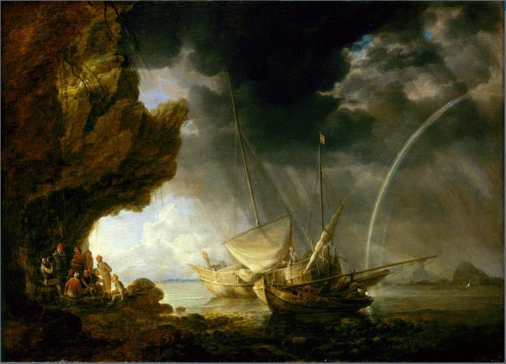 | Keywords: Bonaventura Peeters (I) - Seascape with Sailors Sheltering from a Rainstorm.jpg Artwork Creator Bonaventura Peeters I TA group of sailors huddle in a cave beneath a rugged cliff Torrential rain falls diagonally from the thick black clouds which hover menacingly above A smooth flat sea is rendered in silvery-grey tones While darker areas suggest the shadows of the boats Additionally pale brown and green areas in the shallows hint at the emergence of rocks from beneath the surface of the water The sailors on the left are composed into a tight group Interactions between them are intimated by facial expressions and physical gestures They are variously occupied On the far left one drinks from a barrel Next to him a man huddles wrapped in a shawl While other figures stand nearby or are seated They are accompanied by a small dog on the right One of the seated figures is looking out towards a sailor who remains on one of the boats He in turn looks over towards the sheltering group Their boats with sails lowered and furled are anchored in the shallow water While previously the figures have been interpreted as smugglers sheltering from a storm a more convincing reading suggests that they are in fact fishermen Their humble appearance lends to the idea that Peeters ™s intention was to portray them as quasi-heroic figures happily living an idealized rural existence s 1640 oil oak panel cm 33 2 45 7 Institution National Maritime Museum London object history credit line accession number BHC0759 http //collections rmg co uk/collections/objects/12251 html PD-old-100 Paintings by Bonaventura Peeters I in the National Maritime Museum London 1640s paintings in the United Kingdom 17th-century oil on panel paintings in the United Kingdom |
