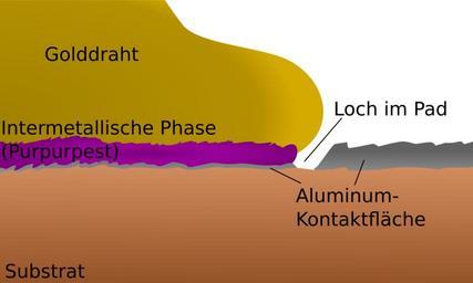 | Keywords: Bondkontakt Gold-Aluminium.svg en Schematic representation of a gold-aluminum bonding contact with an intermetallic phase purple plague de Schematische Darstellung eines Gold-Aluminium-Bondkontakts mit der Ausprägung einer intermetallischen Phase Purpurpest own Cepheiden 2010-04-17 Gold-aluminium intermetallic svg Wire bonding |