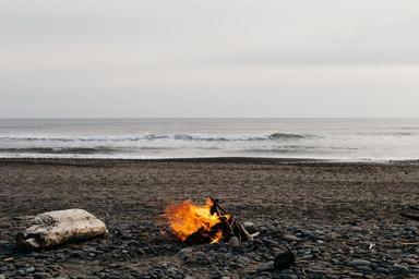 Keywords: bonfire beach sand rocks ocean sea waves horizon sky grey cloudy