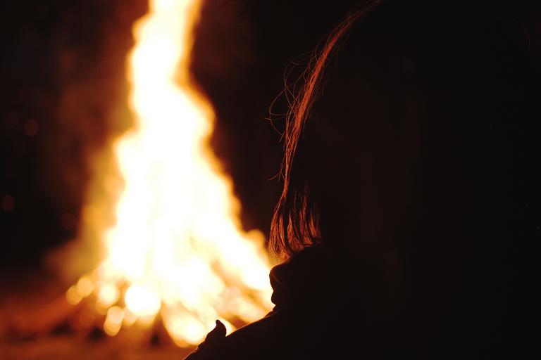 Keywords: bonfire fire flame dark orange silhouette blaze campfire light boy
