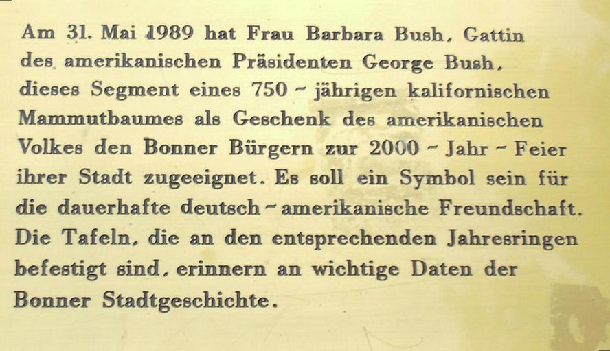 Keywords: Bonn Mammutbaum sign.jpg Schild am Segment eines Mammutbaums im Bonner Freizeitpark Rheinaue Own 2006-09-04 Leit Parks in Bonn Gronau Bonn 2006 in Bonn 20060904