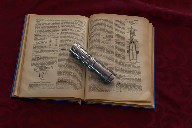 Keywords: book flashlight close background metal alu silver purple fabric old font