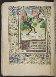 | Keywords: medieval renaissance illumination book of hours bookofhours office of the dead officeofthedead picture frame indoor photo border This Book of Hours was copied in Eastern France between 1425 and 1475. The miniature featured here is one of twelve large miniatures in gold frames, arched at the top and with three or four lines of text underneath. This leaf shows the beginning of the psalm for first vespers in the Office of the Dead. The miniature shows St Michael fighting a devil over two corpses; a third ‘corpse’ is ascending into heaven. The full border is a floral-acanthus design with twining ivy leaves. Immediately below the miniature is a 3-line initial in red, blue and orange with white tracery on a gold ground. The last line of text is completed with a line filler. The Book of Hours was a medieval prayer book used by laymen for private devotion. These books were created for both men and women, but their place in female devotion is particularly noteworthy. The text centres on the Hours of the Virgin, a series of prayers to be said at the eight canonical hours of Matins, Lauds, Prime, Terce, Sext, None, Vespers, and Compline. This Book of Hours was copied in Eastern France between 1425 and 1475. The miniature featured here is one of twelve large miniatures in gold frames, arched at the top and with three or four lines of text underneath. This leaf shows the beginning of the psalm for first vespers in the Office of the Dead. The miniature shows St Michael fighting a devil over two corpses; a third ‘corpse’ is ascending into heaven. The full border is a floral-acanthus design with twining ivy leaves. Immediately below the miniature is a 3-line initial in red, blue and orange with white tracery on a gold ground. The last line of text is completed with a line filler. The Book of Hours was a medieval prayer book used by laymen for private devotion. These books were created for both men and women, but their place in female devotion is particularly noteworthy. The text centres on the Hours of the Virgin, a series of prayers to be said at the eight canonical hours of Matins, Lauds, Prime, Terce, Sext, None, Vespers, and Compline. |