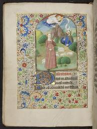 | Keywords: medieval renaissance illumination book of hours bookofhours annunciation to the shepherds annunciationtotheshepherds indoor photo border This Book of Hours was copied in Eastern France between 1425 and 1475. The miniature shown here is one of twelve large miniatures in gold frames, arched at the top and with three or four lines of text underneath. This leaf heralds the beginning of Terce for the Hours of the Virgin. It shows the Annunciation to the Shepherds, when the angel appeared to the shepherds to tell them of the birth of Jesus. The full border consists of a floral acanthus design. Immediately below the miniature is a 3-line initial in red and blue with white tracery on a gold ground. The Book of Hours was a medieval prayer book used by laymen for private devotion. These books were created for both men and women, but their place in female devotion is particularly noteworthy. The text centres on the Hours of the Virgin, a series of prayers to be said at the eight canonical hours of Matins, Lauds, Prime, Terce, Sext, None, Vespers, and Compline. This Book of Hours was copied in Eastern France between 1425 and 1475. The miniature shown here is one of twelve large miniatures in gold frames, arched at the top and with three or four lines of text underneath. This leaf heralds the beginning of Terce for the Hours of the Virgin. It shows the Annunciation to the Shepherds, when the angel appeared to the shepherds to tell them of the birth of Jesus. The full border consists of a floral acanthus design. Immediately below the miniature is a 3-line initial in red and blue with white tracery on a gold ground. The Book of Hours was a medieval prayer book used by laymen for private devotion. These books were created for both men and women, but their place in female devotion is particularly noteworthy. The text centres on the Hours of the Virgin, a series of prayers to be said at the eight canonical hours of Matins, Lauds, Prime, Terce, Sext, None, Vespers, and Compline. |