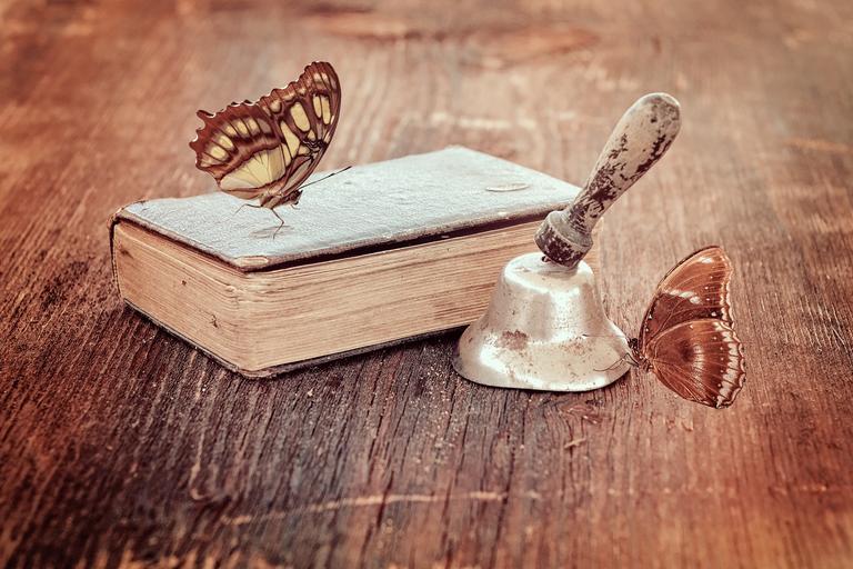 Keywords: book old book bell antique wood wooden table butterflies retro look vintage