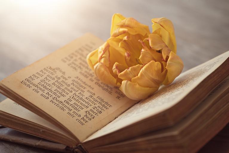 Keywords: book old book old used antique historically still life book pages font flower blossom bloom tulip yellow light close